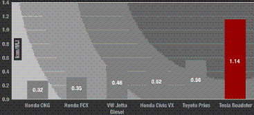 Well-to-Wheel How can you know, with certainty, how efficient one car is versus another? Tesla conducted a “well-to-wheel” accounting for all fuel efficiency and emissions of several types of high-efficiency cars, including an estimate for the Tesla Roadster car, based upon performance prototypes.
